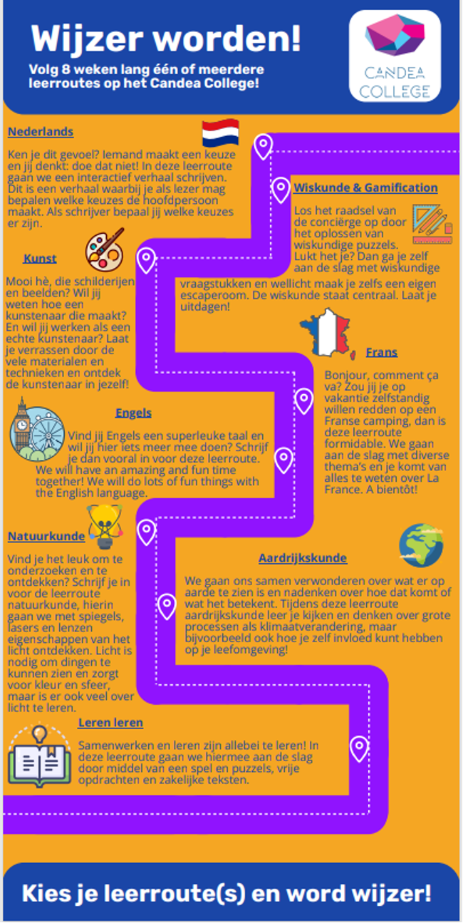 Hoe leren zij? Leerlingen leren door het ervaren naar (zelf fietsen) en in ons schoolgebouw, en het ervaren wat een vak op de middelbare school nu precies inhoudt. Op maat, door te beginnen bij het activeren van voorkennis en hierop verder in te spelen. Candea levert maatwerk: alle reguliere leerlingen, in alle leerjaren en in alle niveaus volgen maatwerklessen. Het project Wijzer Worden, voor kinderen uit groepen 7 & 8 die meer aankunnen, biedt verschillende leerroutes van 8 weken, waarvoor ze worden aangemeld door de keerkracht. Terugkoppeling vindt plaats over het geleerde aan de leerkrachten PO om hierop verder te gaan.