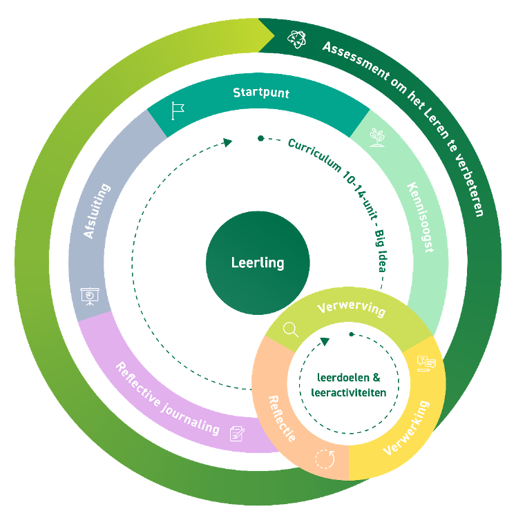 - Wat leren zij? Curriculum en onderwijsconcept zijn een! Grote thema’s die steeds abstracter worden. Het concept gebruikt de SLO-doelen en delen van Jenaplan en Montessorionderwijs, gecombineerd met inzichten vanuit hersenonderzoek (het specifieke tienerbrein).